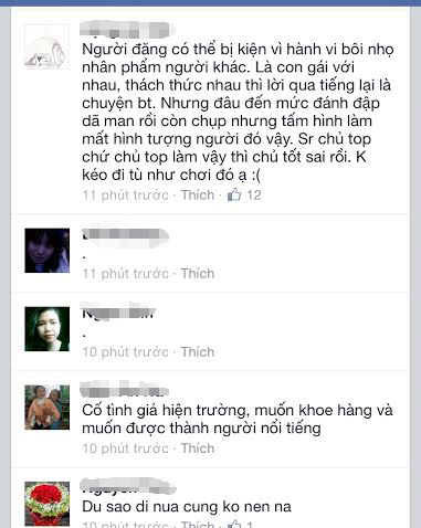 Một bạn đọc bình luận: “Người đăng có thể bị khởi kiện vì hành vi bôi nhọ nhân phẩm người khác. Là con gái với nhau, thách thức nhau thì lời qua tiếng lại là chuyện bình thường. nhưng đâu đến mức đánh đập dã man rồi chụp những tấm hình làm mất hình tượng người đó vậy. Sr chủ top chứ chủ top làm vậy thì chủ top sai rồi. Không kéo đi tù như chơi đó ạL”. Một số bạn khác cũng đã yêu cầu chủ top xóa đi những hình ảnh phản cảm này.