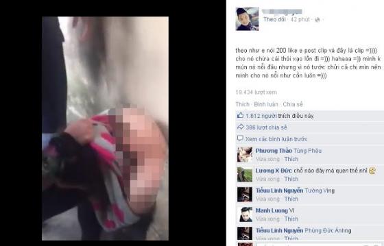 Theo đó, đoạn clip được đăng tải kèm theo dòng status:“Theo như em nói, 200 like em post clip và đây là clip =)))) cho nó chừa cái thói xạo*** đi =))) haaaa =)) mình không mún nó nổi đâu nhưng vì nó tước chửi cả chị mìn nên mình cho nó nổi như cồn luôn =)))”.